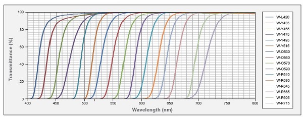 The HOYA W series of optical sharp cut longpass filter material also have an industry leading wavelength tolerance of ±5nm for filters up to W-R695All HOYA W series filters are made from GENIUNE HOYA Material